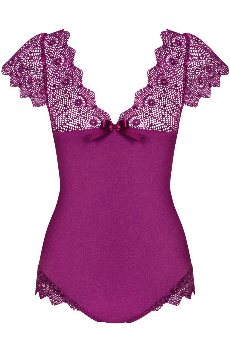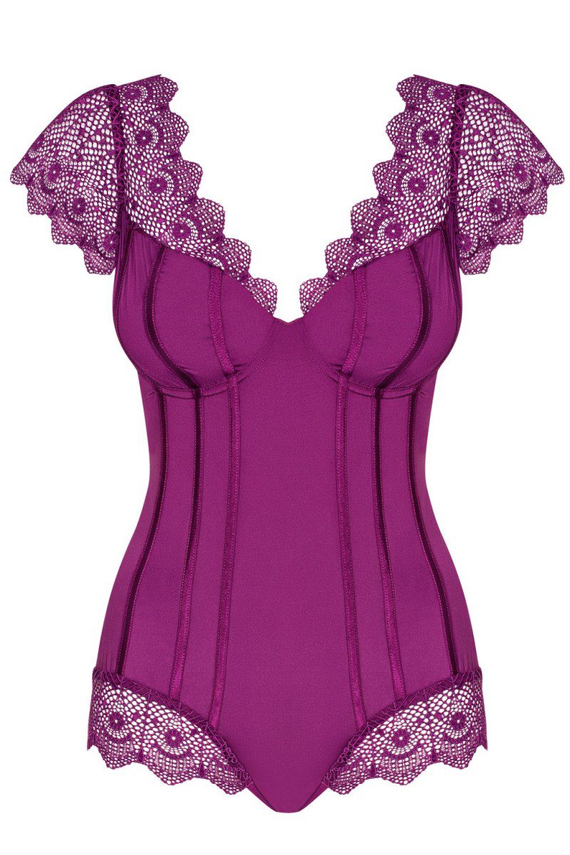 Elegante body realizzato in morbidissimo tessuto elasticizzato viola e pizzo ricamato. Coppe morbide con ferretto, spalline regolabili. Chiusura regolabile al cavallo con gancetti. Linea Sexy di Obsessive Lingerie. Perfetta vestibilità grazie al tessuto multistretch. Edizione Limitata.