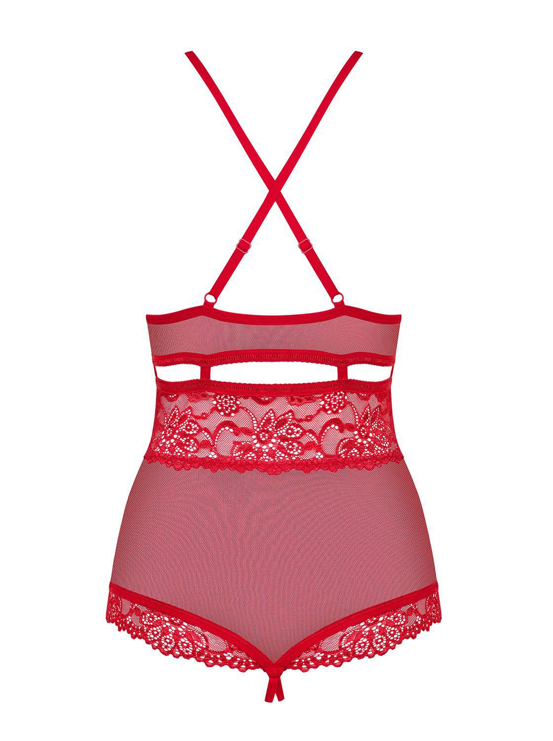 Sensuale body in morbido pizzo e tulle con delizioso inserto in strass senza nichel. Spalline e stringhe regolabili, aperto al cavallo. Linea Spicy di Obsessive Lingerie.