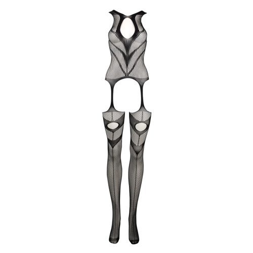 Questa bodystocking a reggicalze con collo alto e apertura a goccia sul décolleté è la perfetta fusione tra eleganza e sensualità. Il design combina motivi coprenti a contrasto con la rete, creando un effetto visivo deciso e irresistibile.