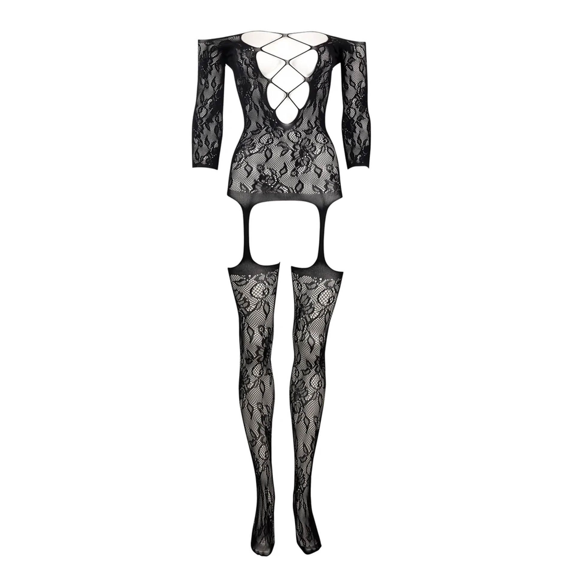 Questa bodystocking a reggicalze con motivo in pizzo e profonda scollatura a V conquista al primo sguardo. Le stringhe incrociate valorizzano il décolleté con un tocco raffinato e provocante, mentre il taglio versatile permette di indossarla con le spalle scoperte o classiche, per due look seducenti in uno.