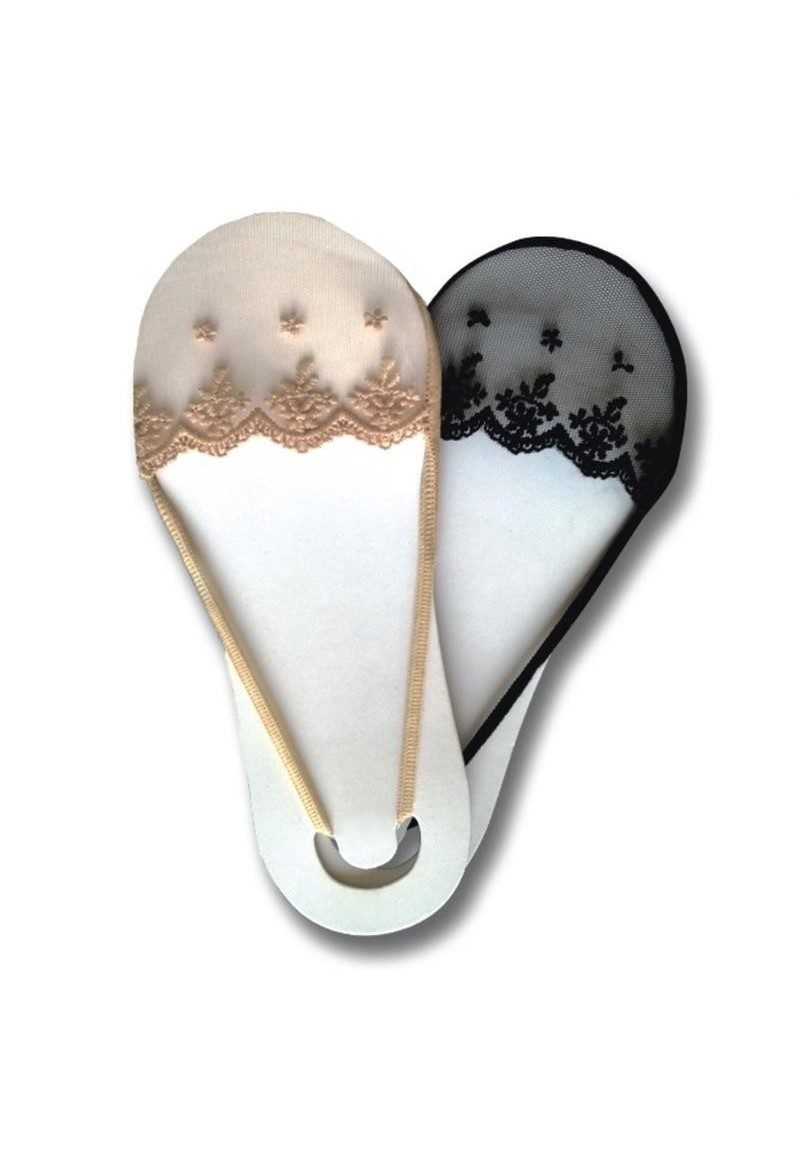 Calzini salvapunta da donna in microrete con bellissimi ricami floreali, suola in morbido tessuto elasticizzato. Grazie all’elastico di sostegno dietro il tallone il calzino non scivola. Taglia unica. Colori: nero, nude.