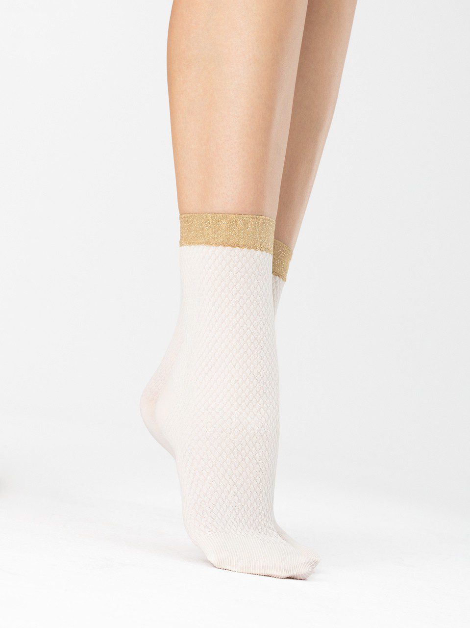 Calzini color ecru rosa fantasia che ricorda il cono del gelato o biscotto, dolce e delizioso. Polsino comfort con lurex glitterato. Questi calzini sono un accesorio perfetto per i tuoi outfit autunnali.