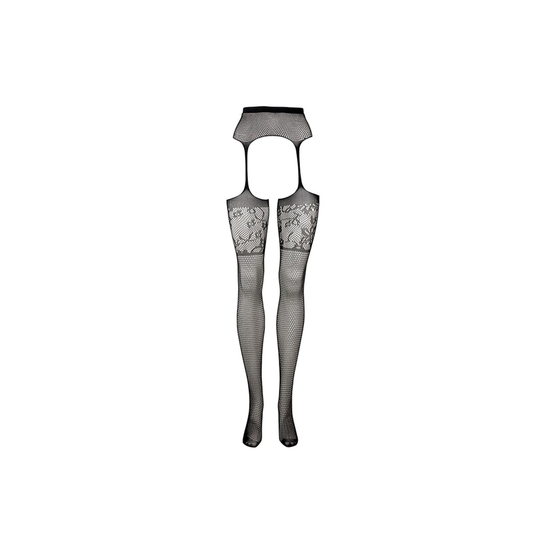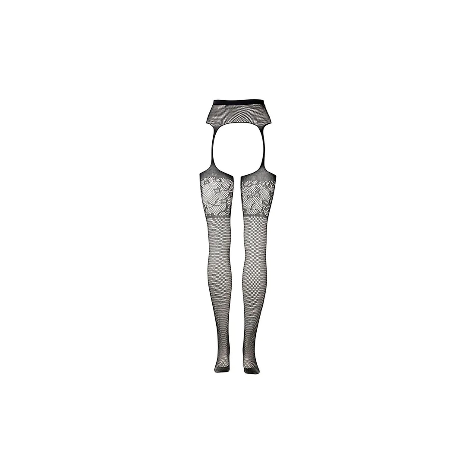 Classiche calze a rete con reggicalze, rifinite da unelegante balza effetto pizzo che aggiunge un tocco di femminilità e sensualità.