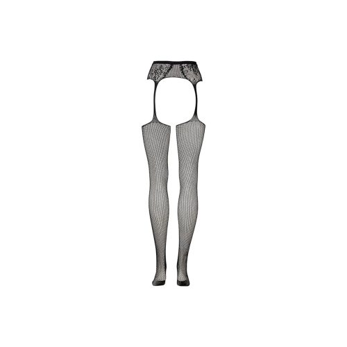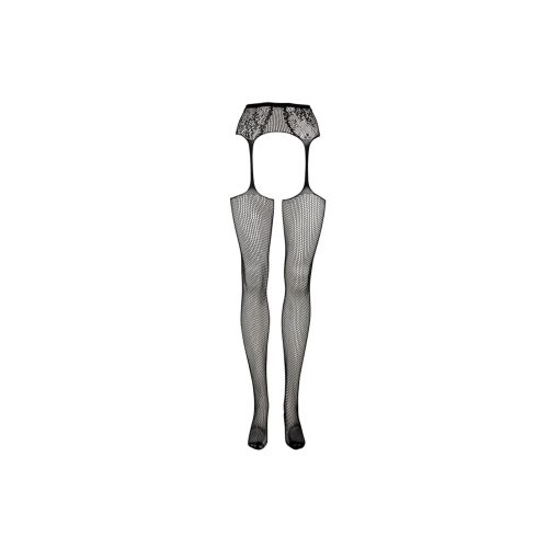 Classiche calze a rete con reggicalze, impreziosite da una raffinata balza in pizzo che aggiunge un irresistibile tocco di femminilità.
