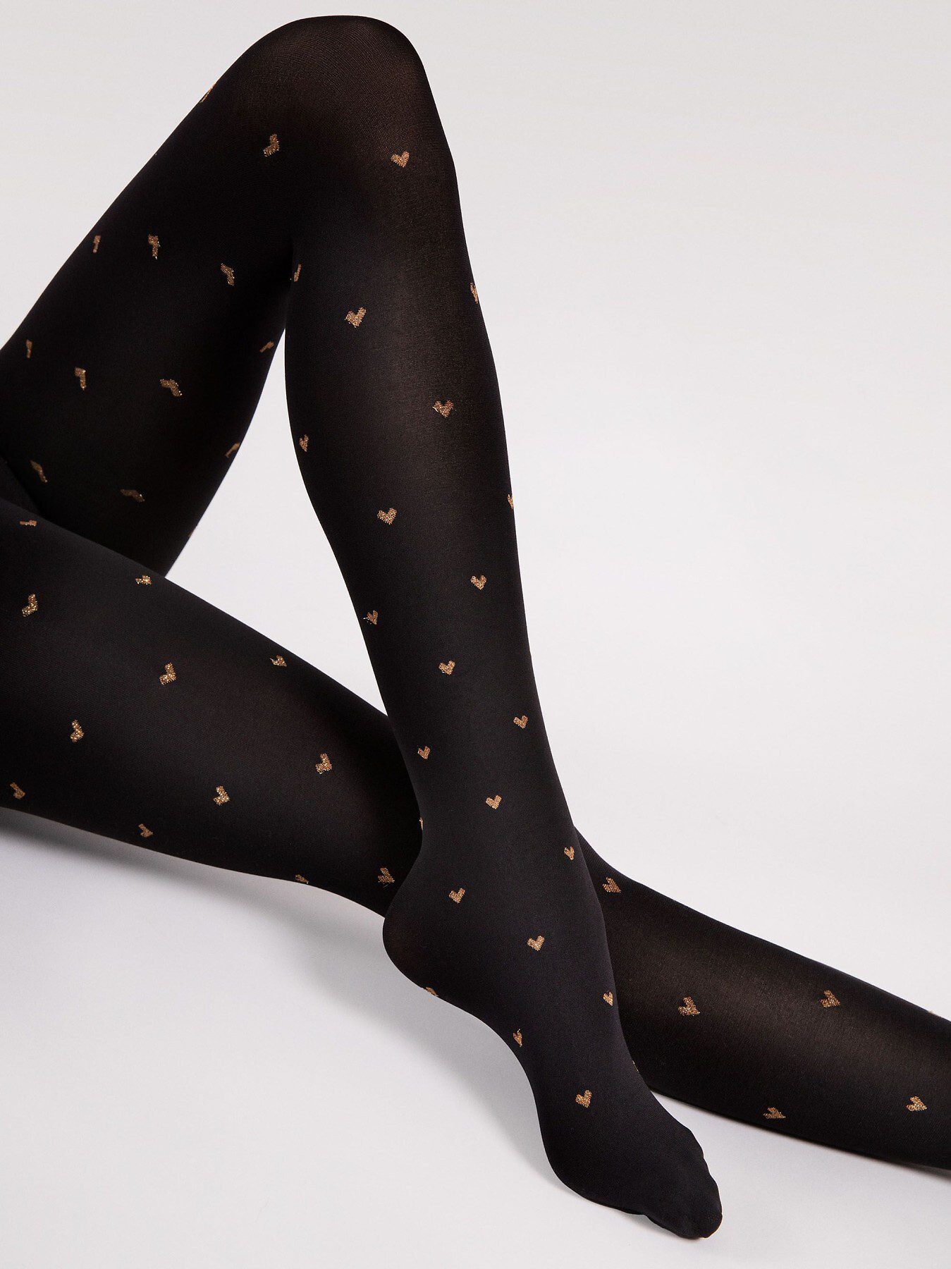 Bellissimi collant coprenti neri con cuoricini scintillanti color oro rosa.