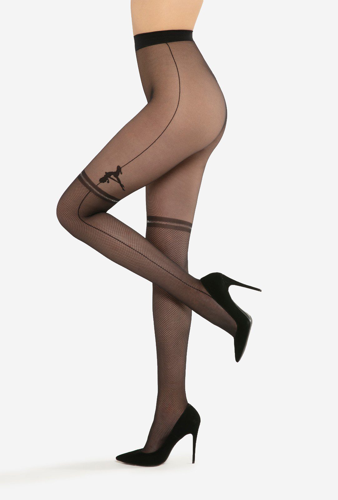 Collant fantasia effetto calze a rete con riga glitterata in lurex argentato sopra la balza, riga laterale e disegno ballerina lap dance.