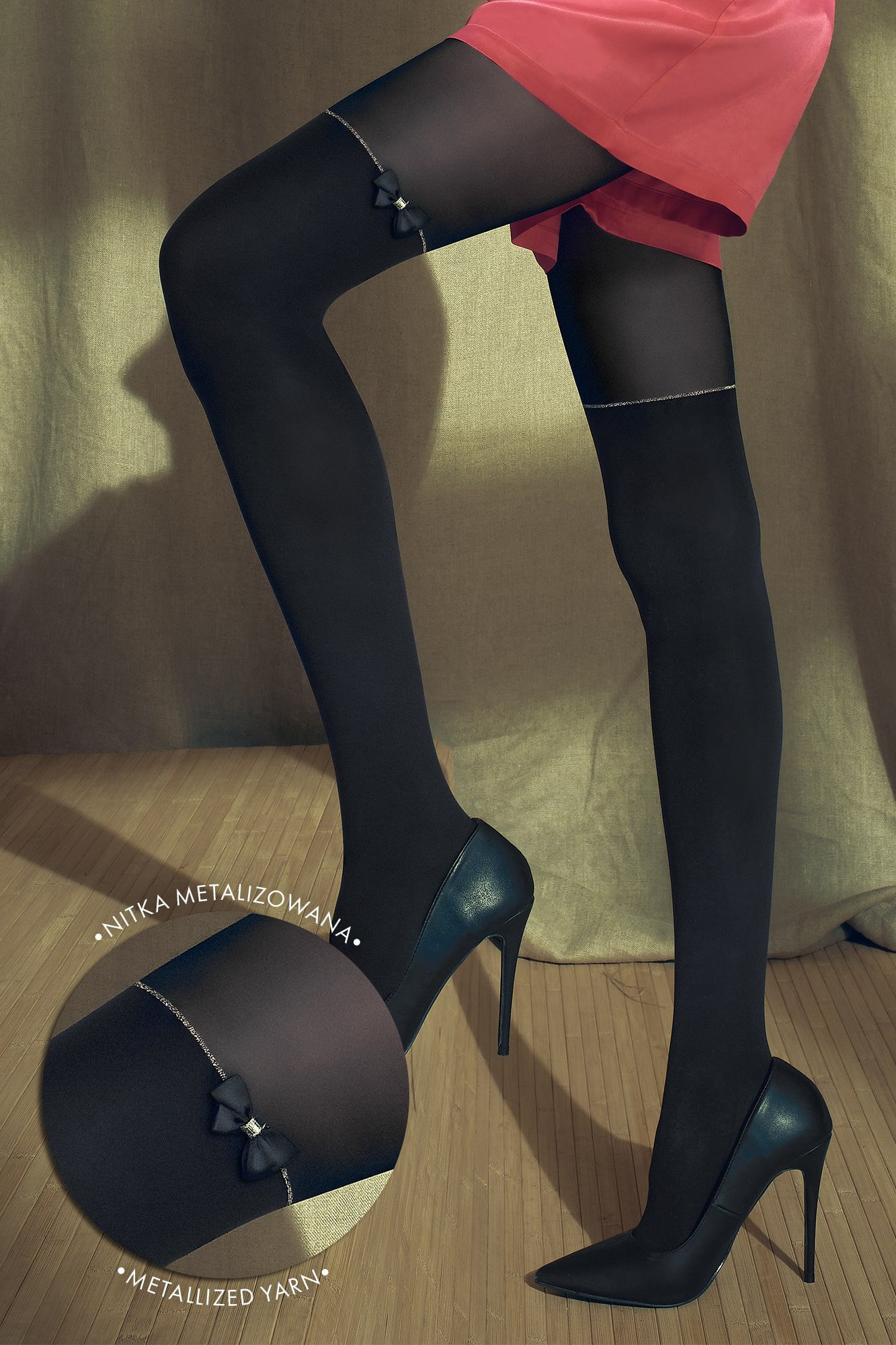 Collant donna in microfibra 3D effetto calze con fiocco in raso e riga in lurex. Collant coprente finte calze parigine modello Jazzy. 50 denari. Tassello in cotone, cucitura piatta, punta rinforzata. Molto morbido e piacevole al tatto.