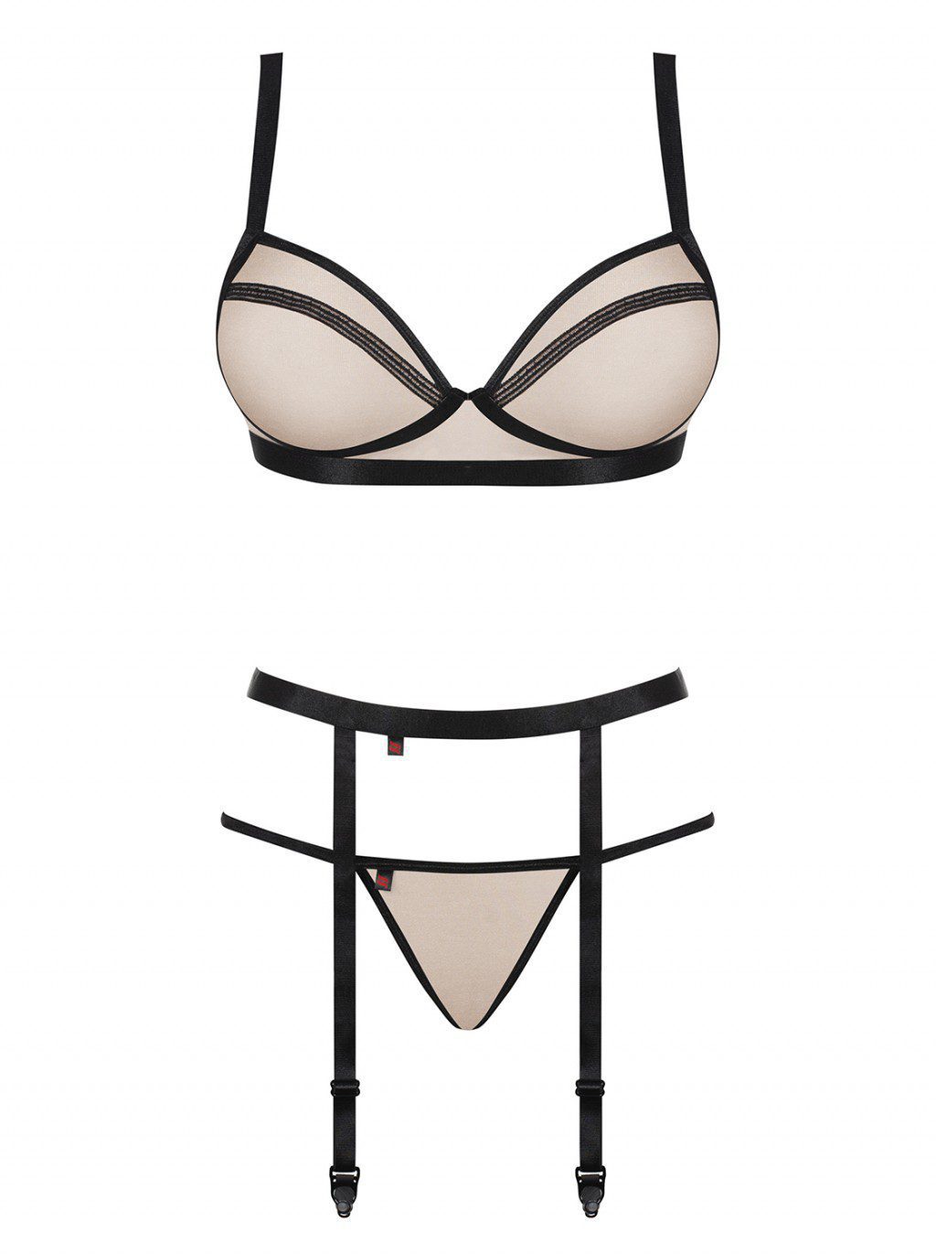 Sensuale completino intimo trasparente tre pezzi realizzato in bellissimo tulle lucido beige con bande elasticizzate nere.
