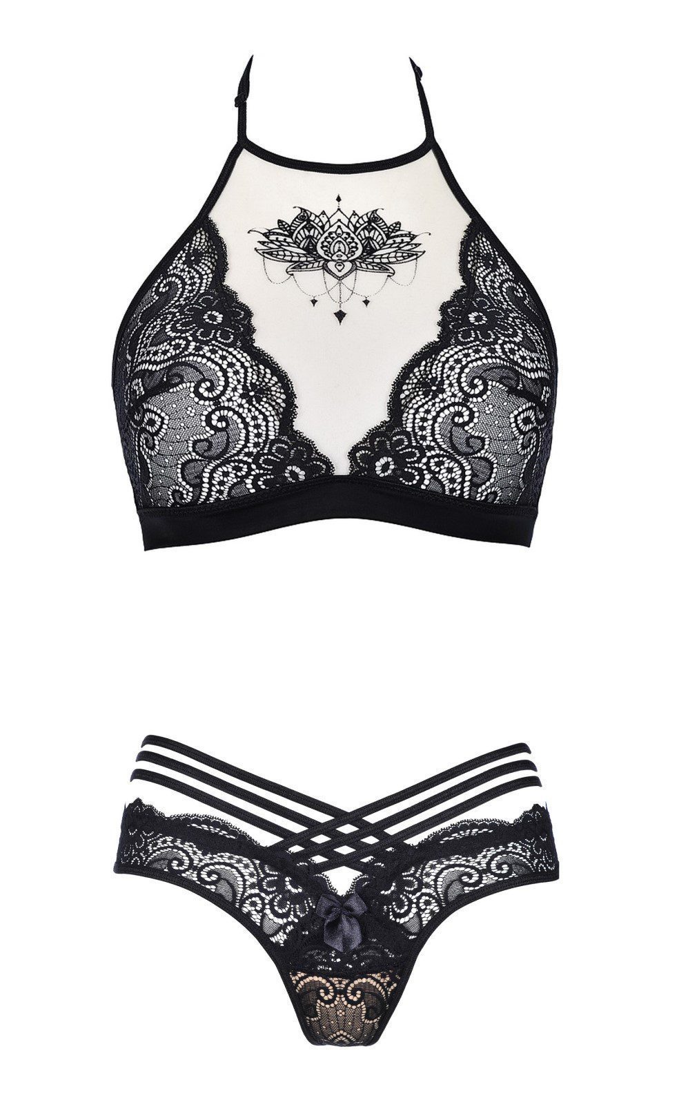 Elegante completino intimo stringato realizzato in morbido tulle trasparente colore beige con delizioso disegno vellutato floreale, pizzo nero e stringhe elasticizzate.