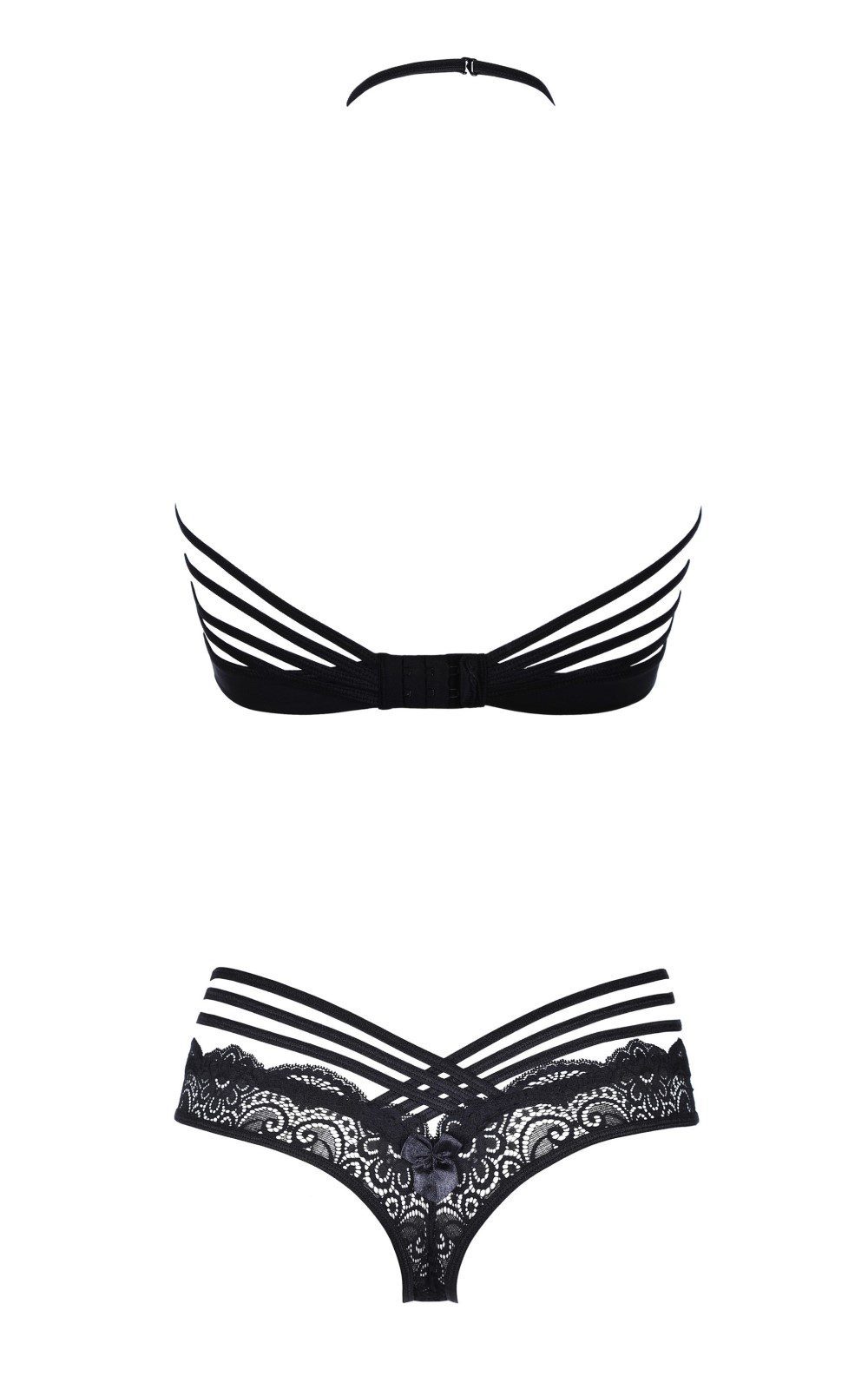 Il top morbido è in tulle beige trasparente con un bellissimo disegno vellutato e pizzo nero ricamato a forma del reggiseno a triangolo. La chiusura dietro a doppi gancetti regolabile in tre posizioni. Chiusura dietro il collo con gancetto, stringha regolabile in lunghezza. La banda sottoseno in morbido tessuto satinato elasticizzato.