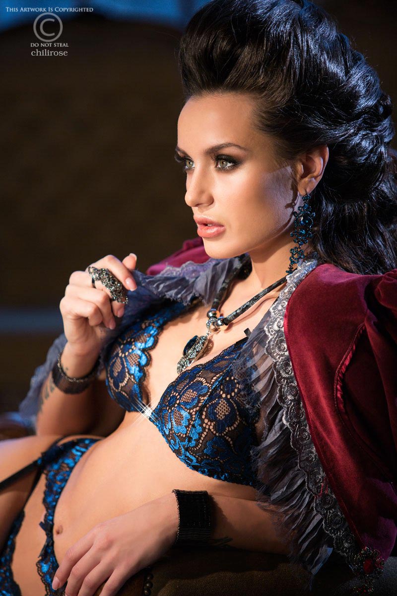 Raffinato completo intimo 3 pezzi in pizzo floreale nero/blu zaffiro abbellito con lucenti strass e piccoli fiocchetti neri in raso.