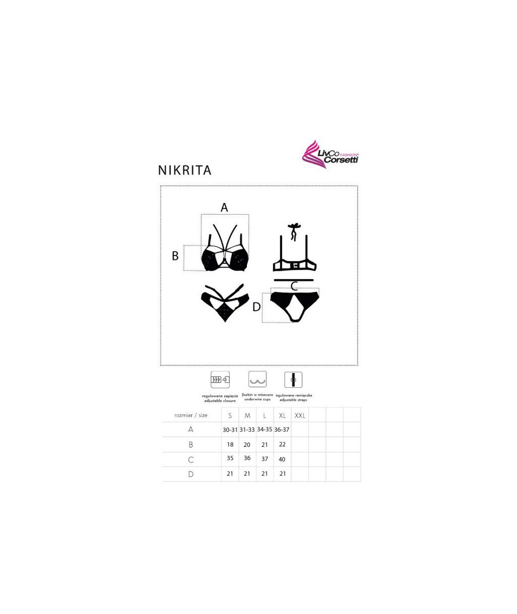 Il set comprende: un reggiseno con coppe morbide con ferreto per miglior sostegno del seno, un cordoncino da atttaccare al reggiseno e una mutandina aperta dietro.