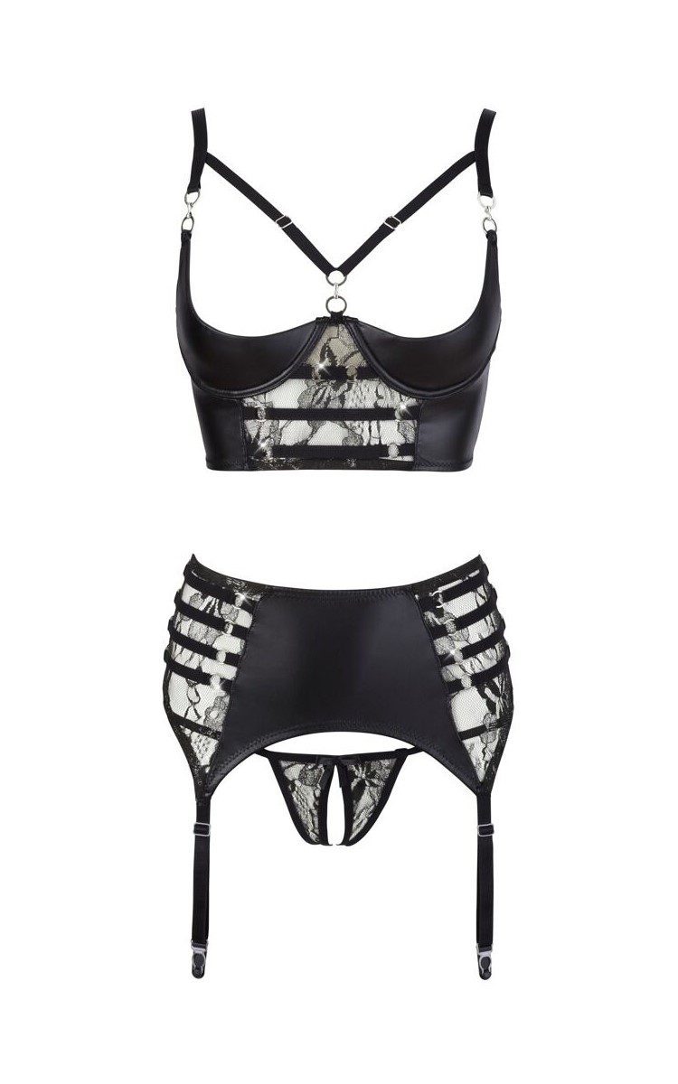 Stravagante completino intimo aperto in morbido tessuto elasticizzato simil latex e bellissimo pizzo ricamato. Set 3 pezzi include reggiseno, reggicalze e perizoma.