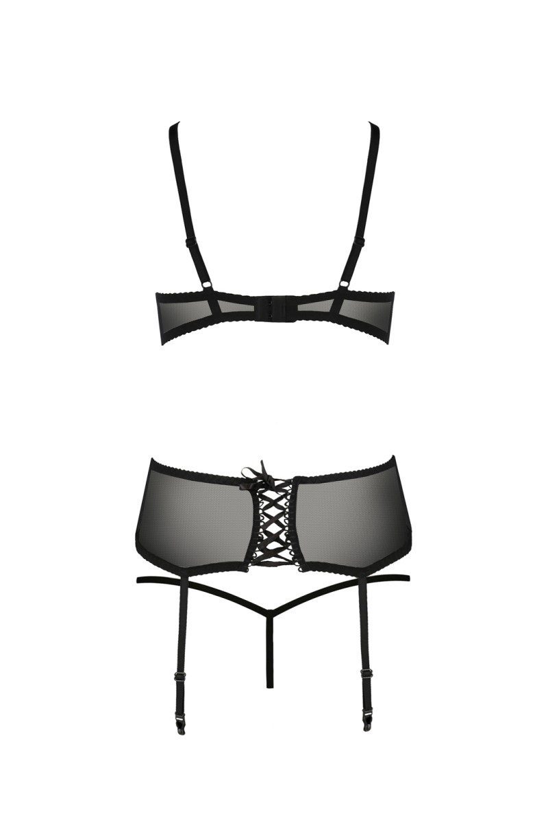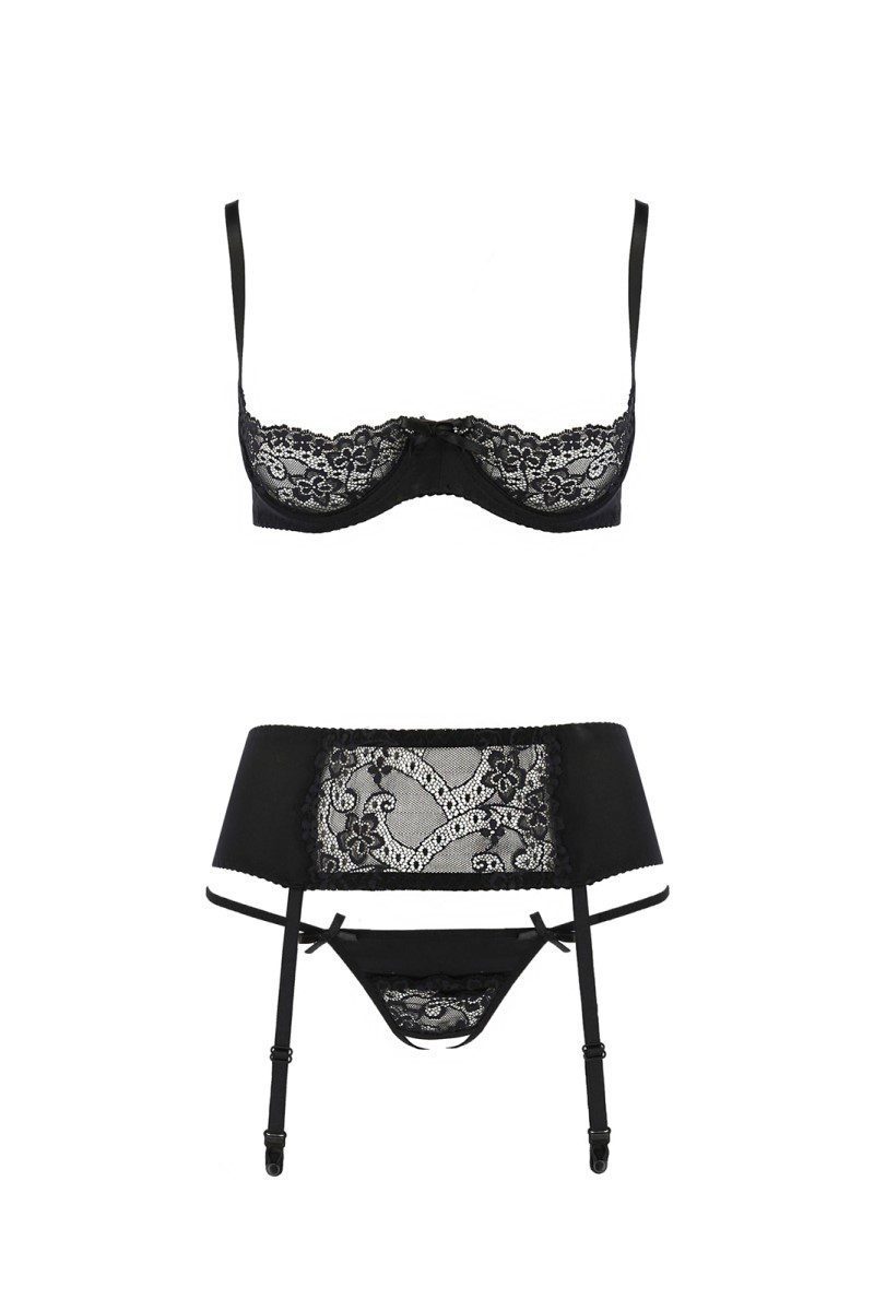 Reggiseno a mezza coppa morbida lascia il seno scoperto e rende questo completo molto seducente, ha la chiusura posteriore a doppi gancetti regolabile in 2 posizioni, bretelle regolabili in lunghezza. Il reggicalze in bellissimo tessuto satinato e pizzo con raffinati ricami, stringatura posteriore per una perfetta vestibilità. Un perizoma aperto sotto incluso nella confezione.