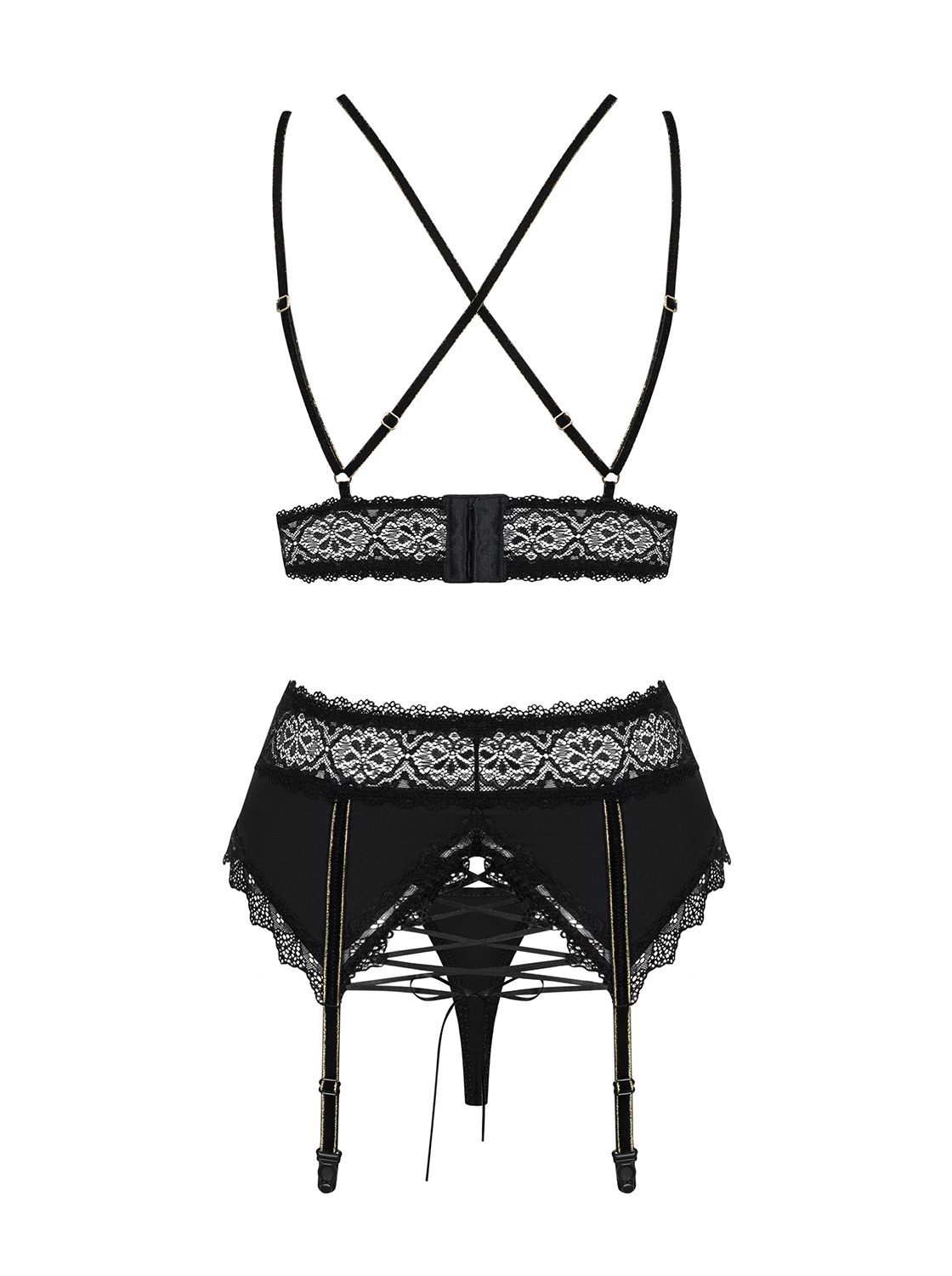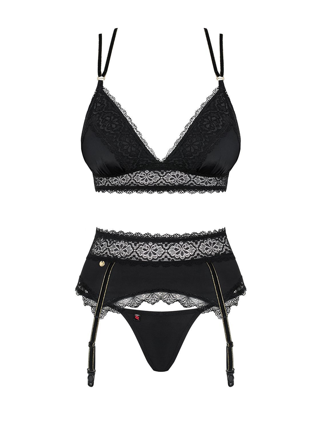 Completo intimo tre pezzi in morbidissimo pizzo nero composto da reggiseno con coppe leggermente impottite senza ferretto, reggicalze decorato da una allacciatura posteriore e perizoma. Spalline del reggiseno e stringhe sono realizzate in velluto, decorate da dettagli dorati e sono regolabili. Linea SEXY di Obsessive Lingerie.