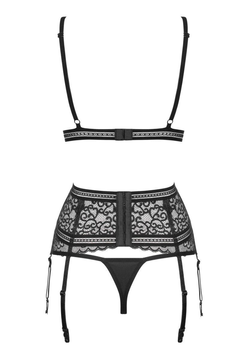 Set 3 pezzi realizzato in morbidissimo ed elasticizzato pizzo ricamato nero composto da un reggiseno con morbide coppe a triangolo senza ferretto, un reggicalze con chiusura a gancetti regolabile e un tanga coordinato. Nickel free. Calze NON sono incluse nella confezione. Linea SEXY di Obsessive Lingerie.
