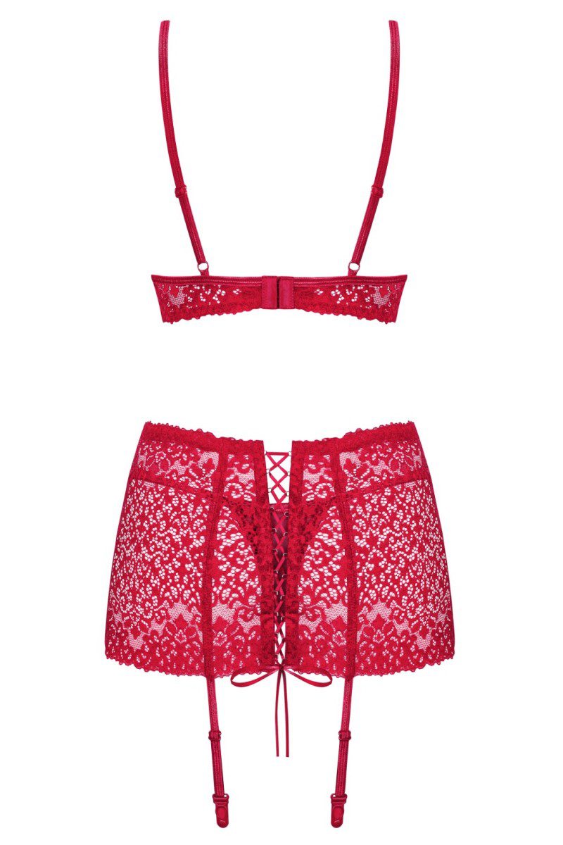 Completo intimo realizzato in bellissimo pizzo elasticizzato color rosso rubino e tulle. Set 3 pz composto da un reggiseno con coppe imbottite e dotate di ferretto, spalline e chiusura a gancetti regolabili. Un reggicalze a vita alta con stringatura posteriore e un perizoma coordinato. Un perfetto regalo per Natale o San Valentino. Calze NON sono incluse e sono vendute separatamente. Linea SEXY di Obsessive Lingerie.