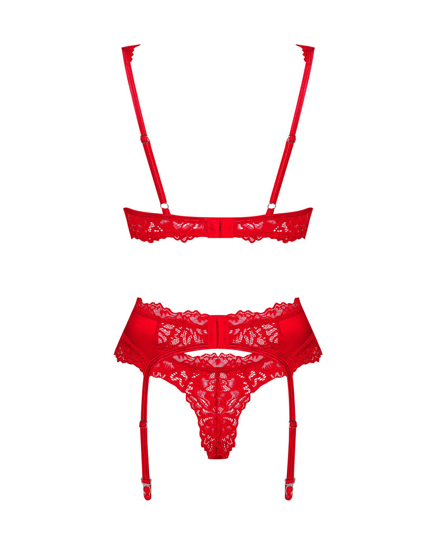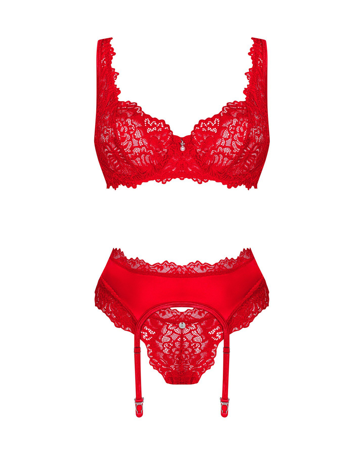 Completino intimo in bellissimo pizzo ricamato rosso Amor Cherris. Set 3 pezzi composto da un reggiseno con coppe morbide e ferretto di sostegno, un reggicalze e un perizoma.