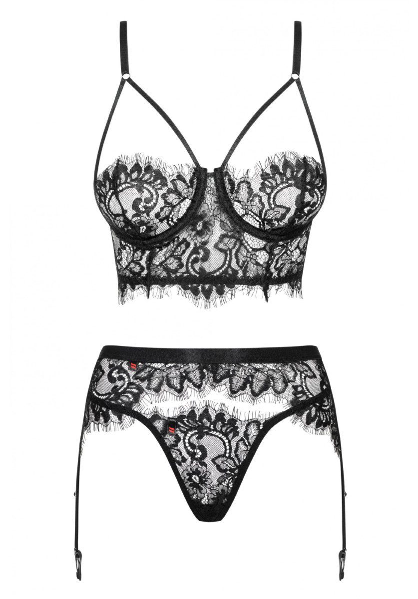 Sensuale ed elegante completino nero tre pezzi realizzato in morbido ed elasticizzato pizzo cigliato. Composto da un top con reggiseno a mezza coppa, un reggicalze ed un perizoma coordinato. Il pizzo è finemente ricamato dall’effetto vedo non vedo.