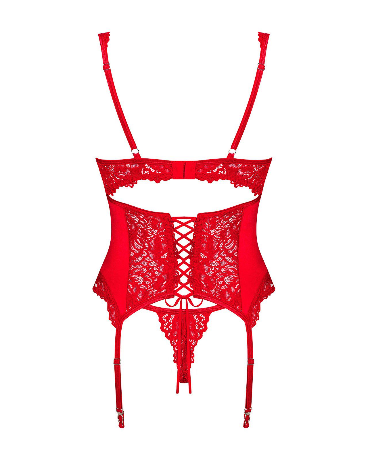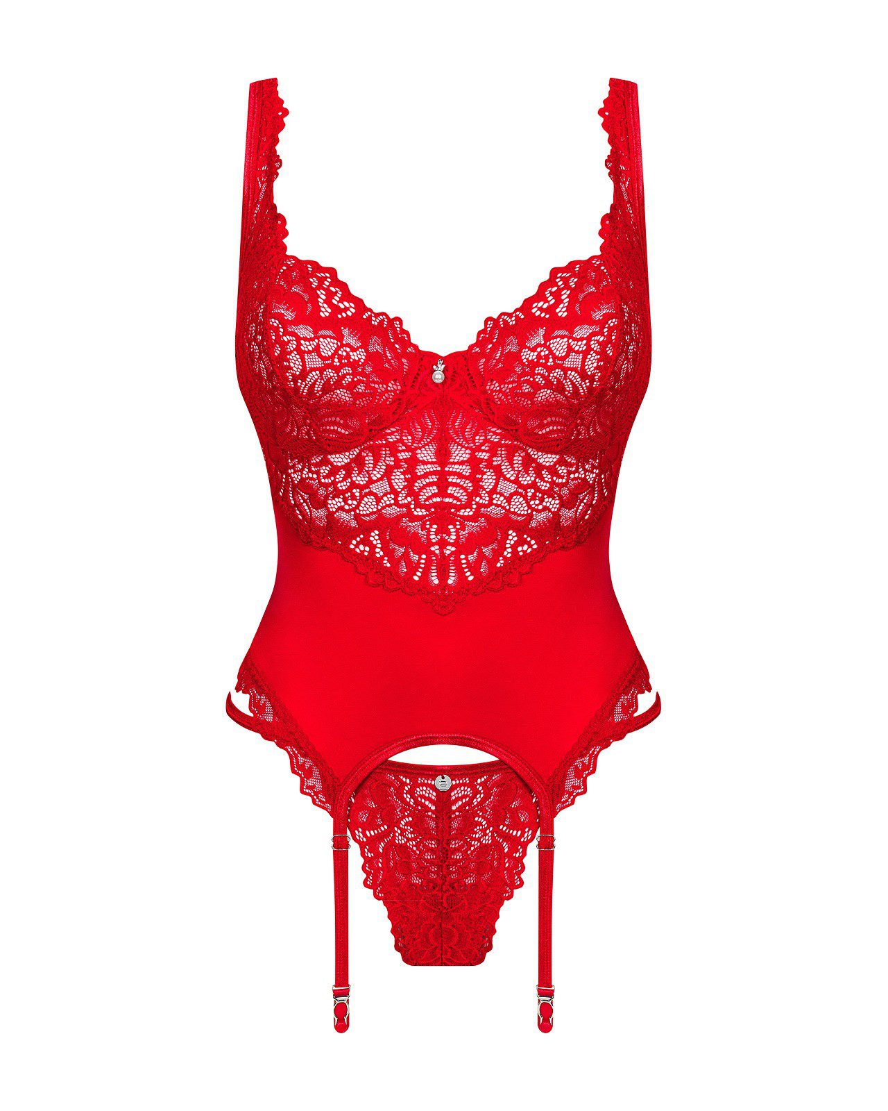 Guepiere rossa in morbido pizzo e tessuto elasticizzato rosso. Coppe morbide dotate di ferretto. Stringatura posteriore per una perfetta vestibilità. Chiusura regolabile a gancetti dietro. Perizoma coordinato in pizzo incluso.
