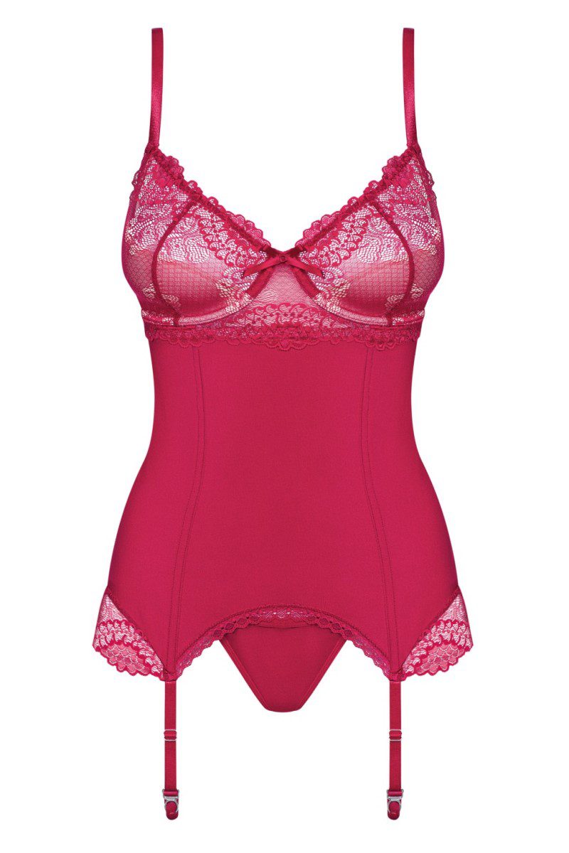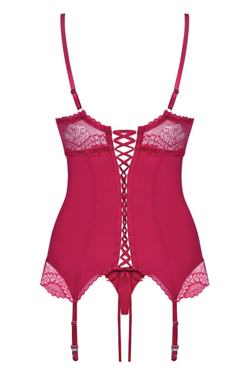 Bellissimo corsetto con stringatura posteriore realizzato in tessuto elasticizzato rosso e morbido pizzo con coppe grandi imbottite dotate di ferretto, munito di quattro reggicalze e spalline ricamate regolabili. Perizoma coordinato incluso. Linea Sexy di Obsessive Lingerie. Creato per le donne con seno prosperoso.