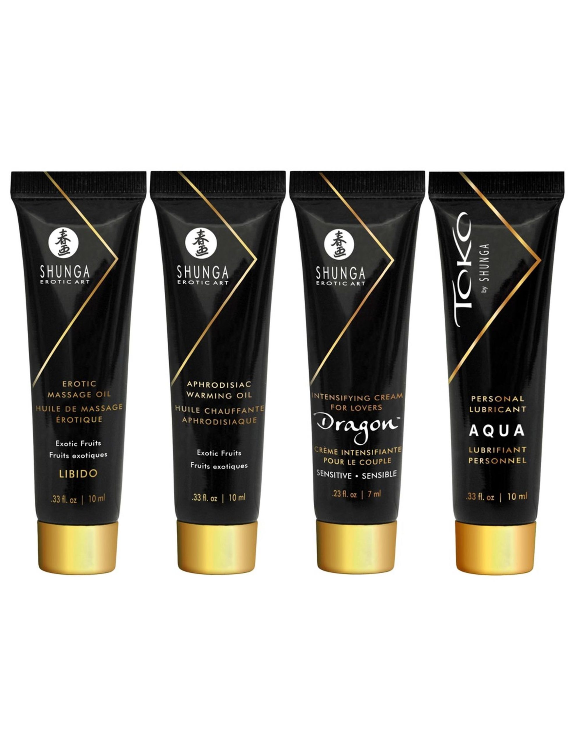 1 x Olio da massaggaio erotico, 10 ml1 x Olio riscaldante afrodisiaco, 10 ml1 x Candela da massaggio, 30 ml1 x Lunrificante a base d’acqua, 10 ml1 x Dragon Crema initma stimolante per coppia, 7 ml
