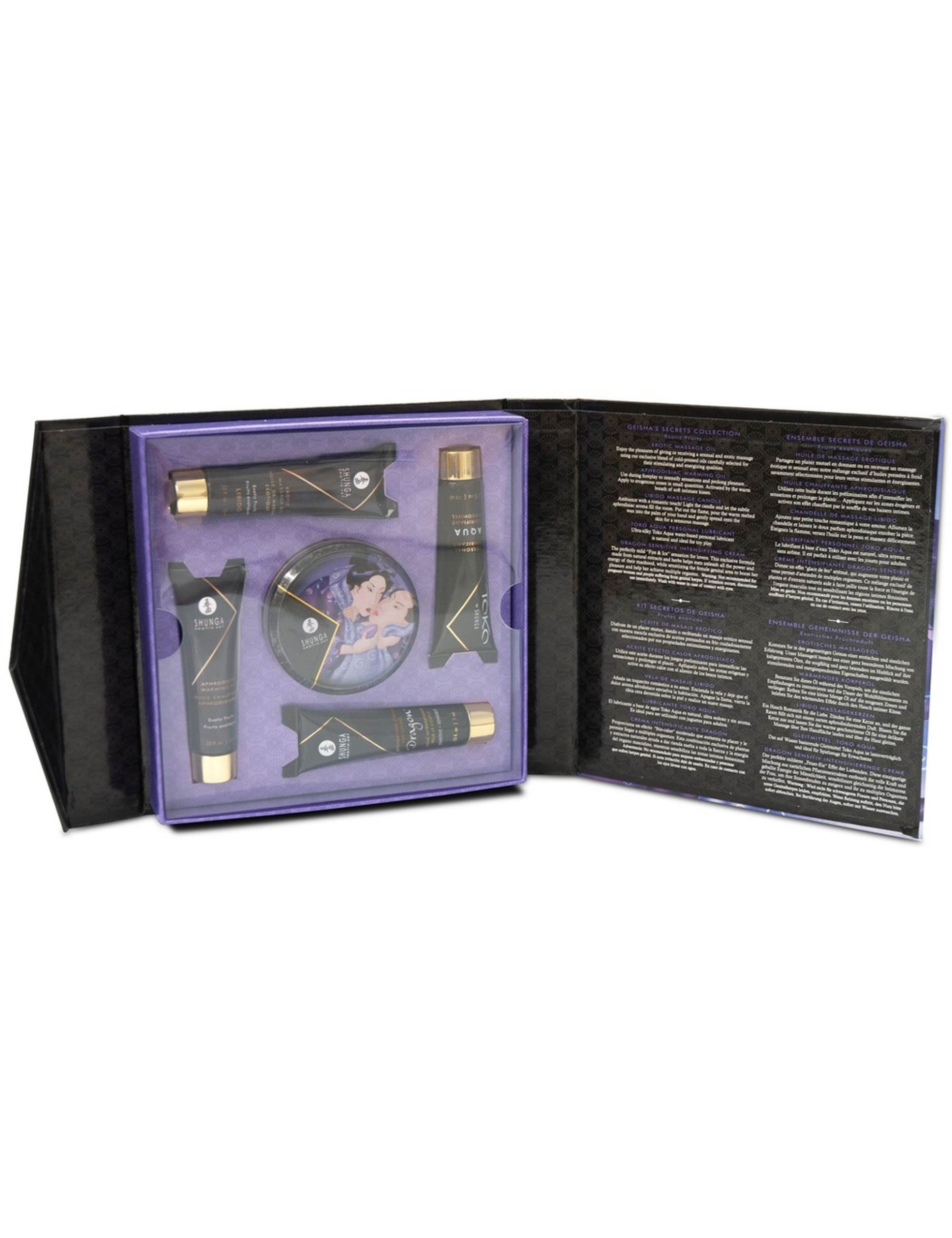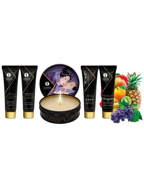 Il Geisha’s Secret Kit Exotic Fruits è un set sensuale di 5 prodotti pensato per massaggi intimi e giochi erotici da vivere in coppia.