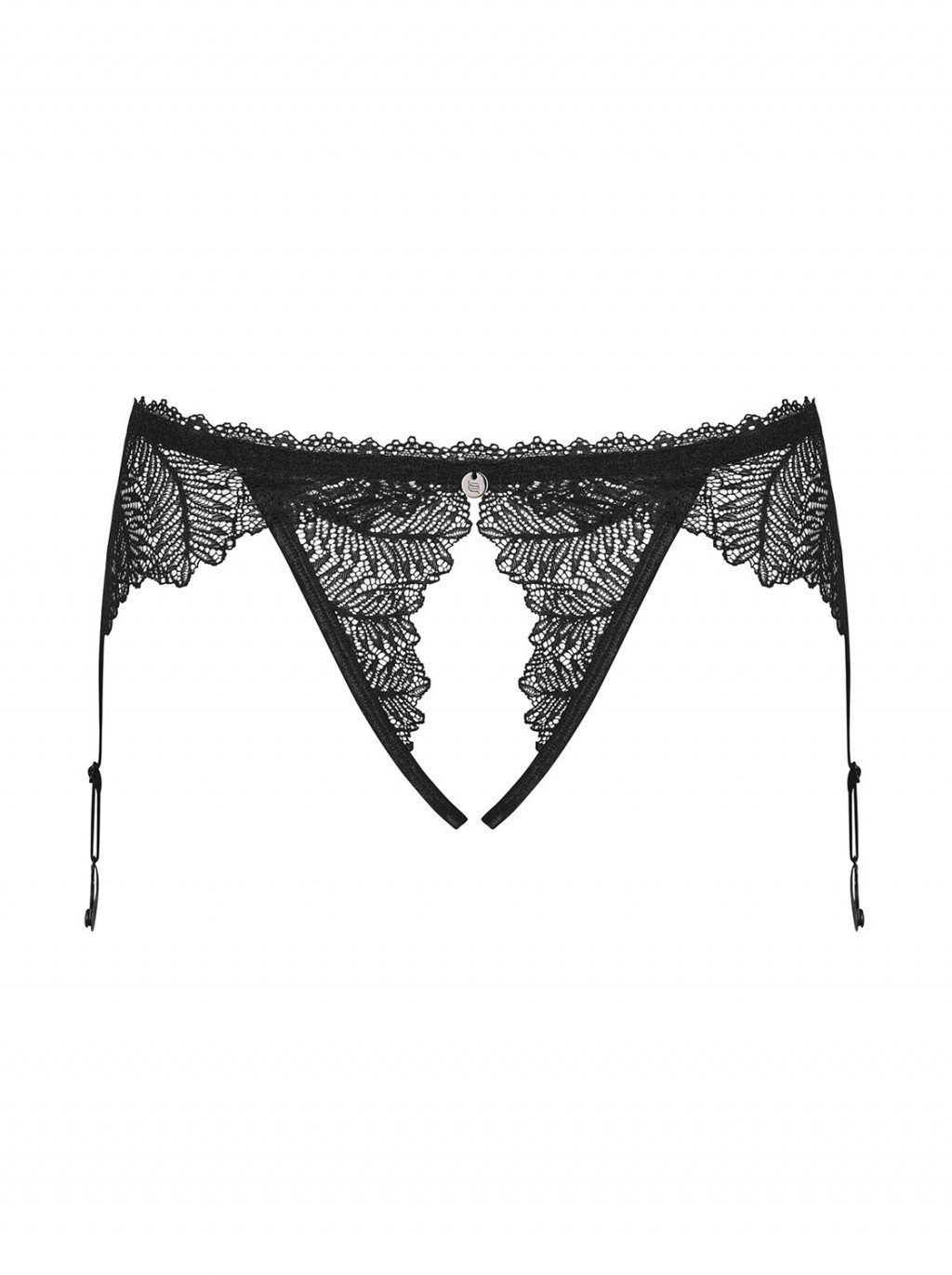 Piccante mutandina reggicalze realizzata in morbido pizzo elasticizzato nero. Completamente aperta sotto. Simpatica nappina dietro dà un tocco giocoso.