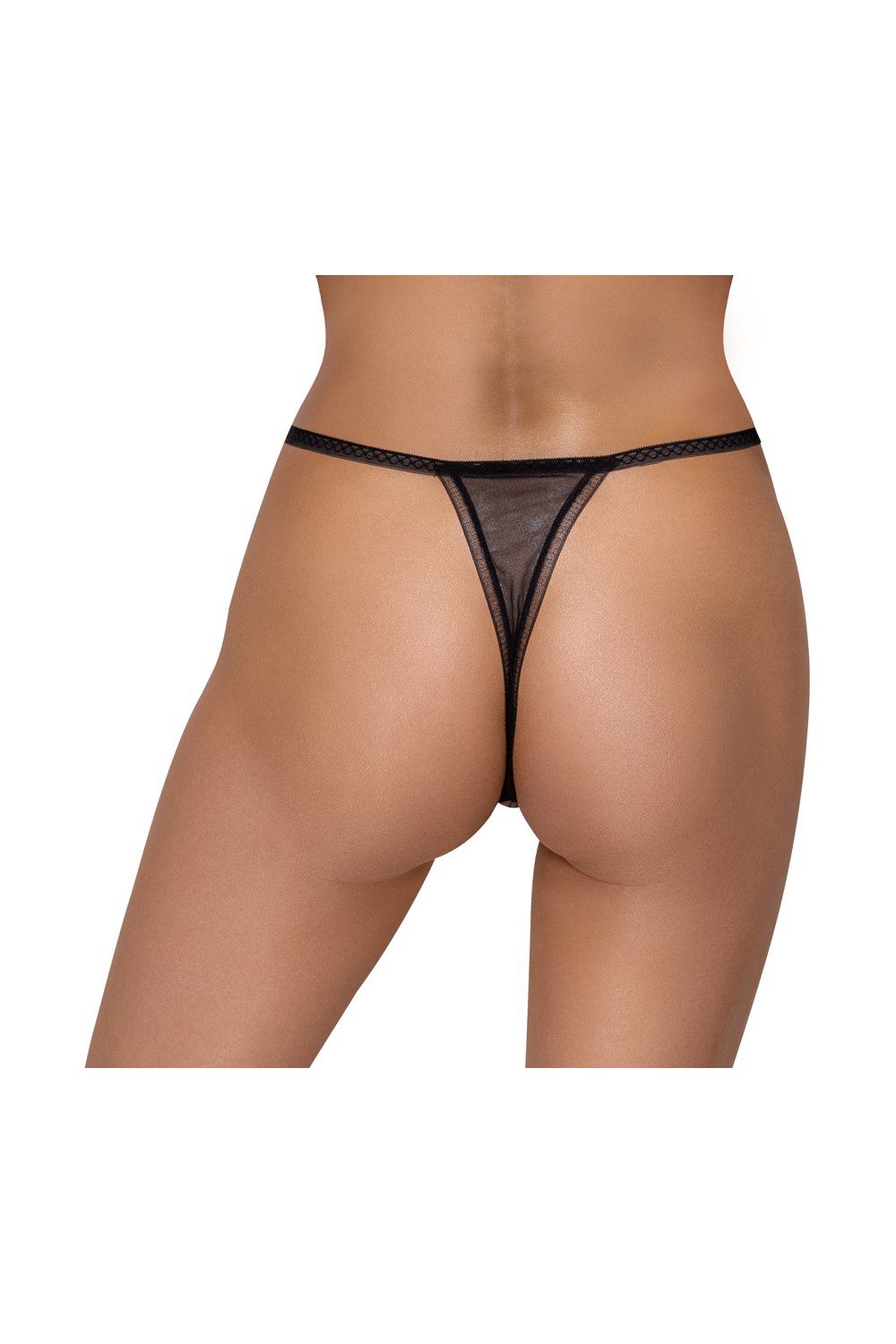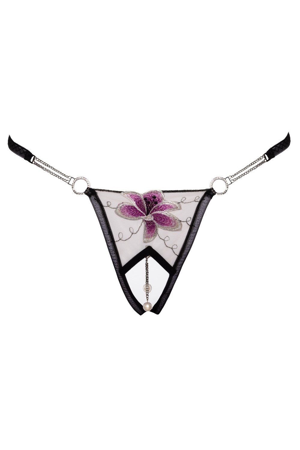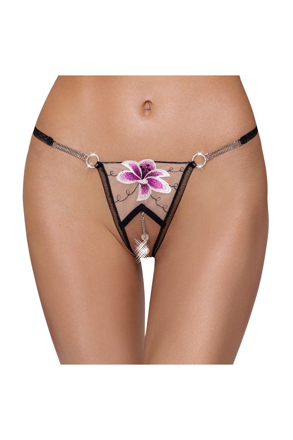 Raffinatoperizoma aperto sotto in tulle trasparente con ricamo floreale. Provocante apertura sotto. Fianchetti valorizzati da catenina attaccata agli anelli con bellissimi strass.