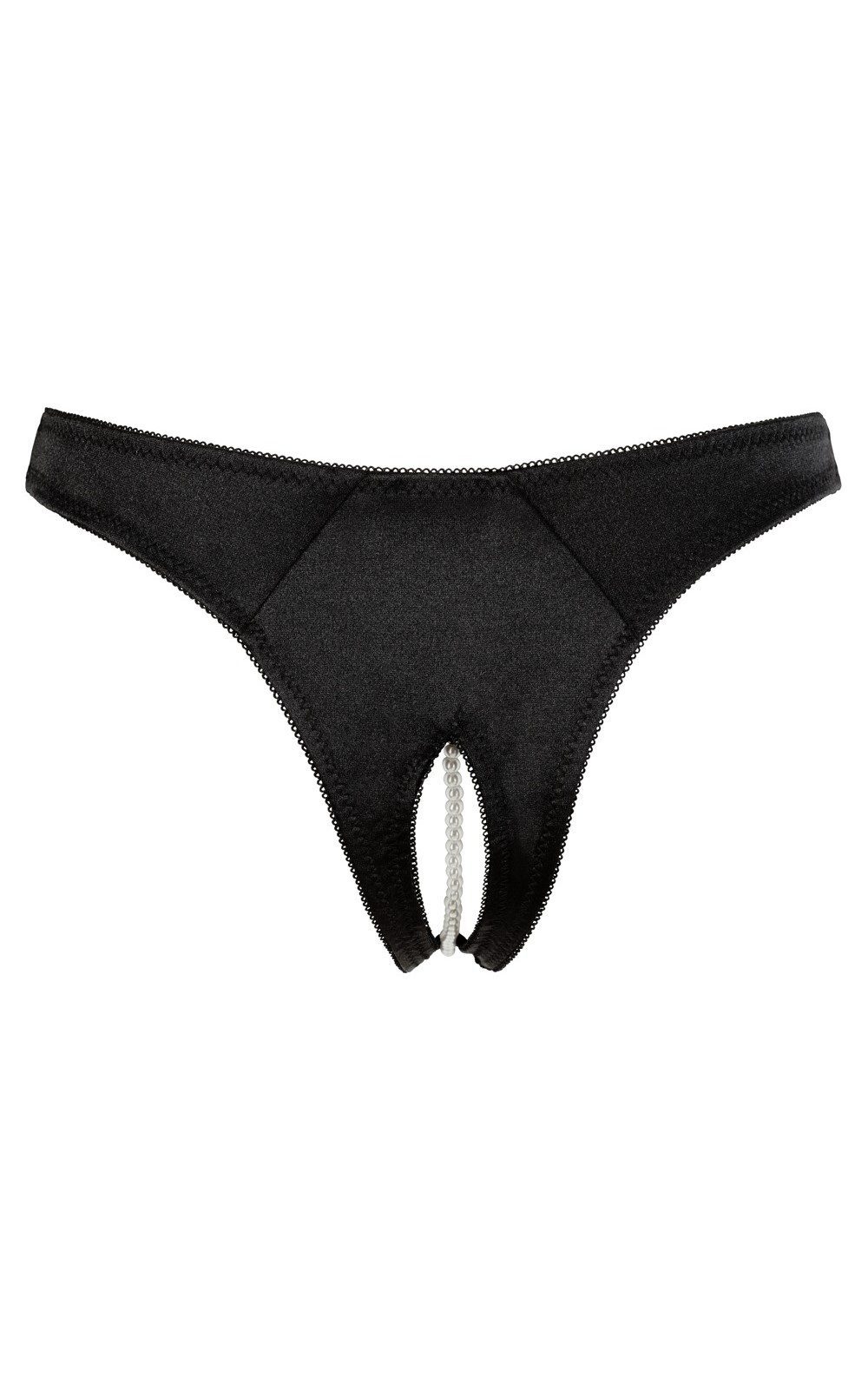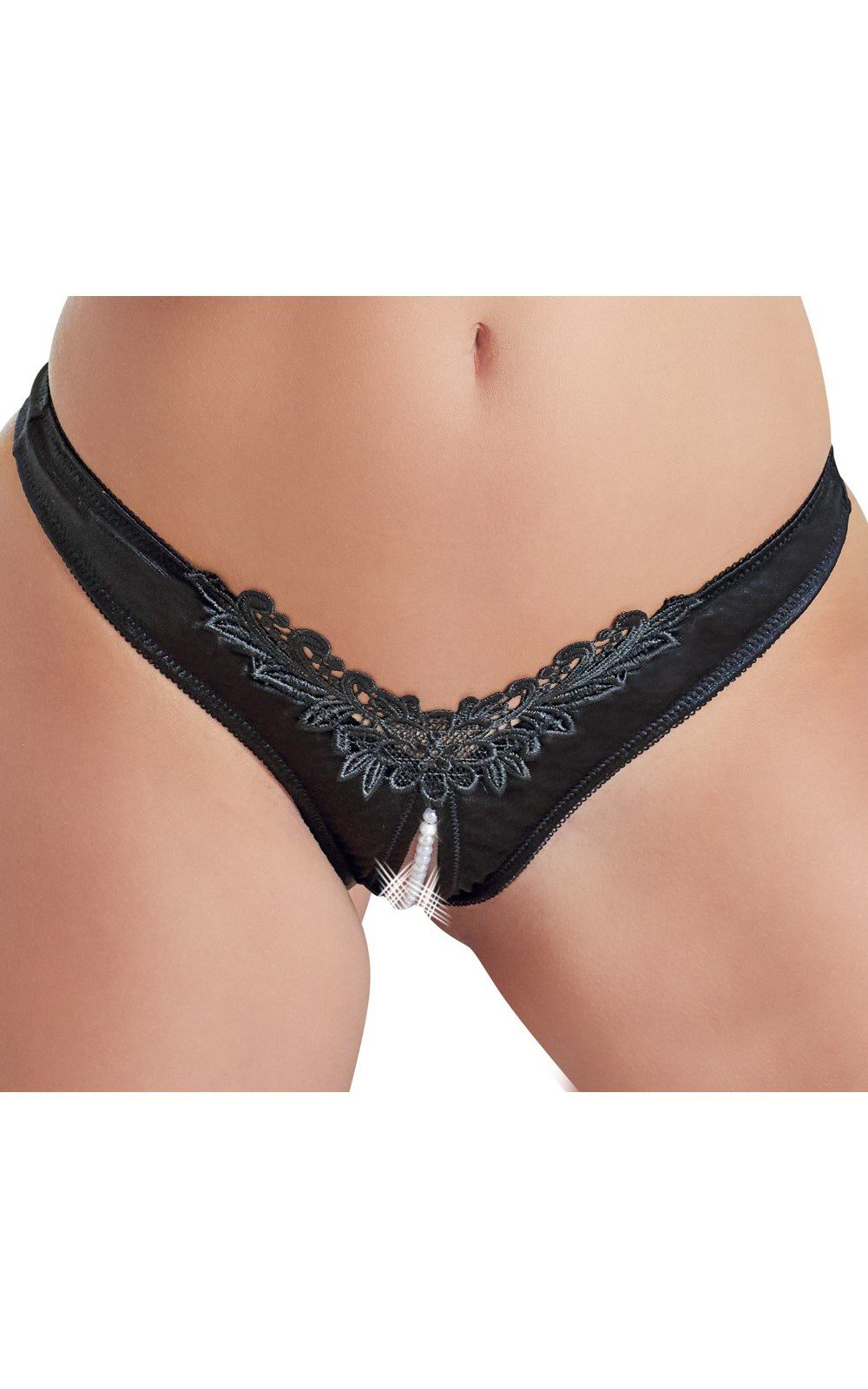 Mutandina aperta sotto in tessuto satinato nero con filo di perline e bellissimi ricami davanti. Mutandina nera molto provocante e sensuale. tessuto elasticizzato per una perfetta vestibilità.