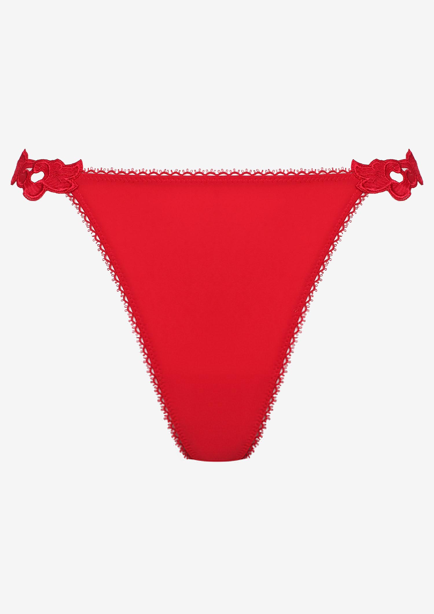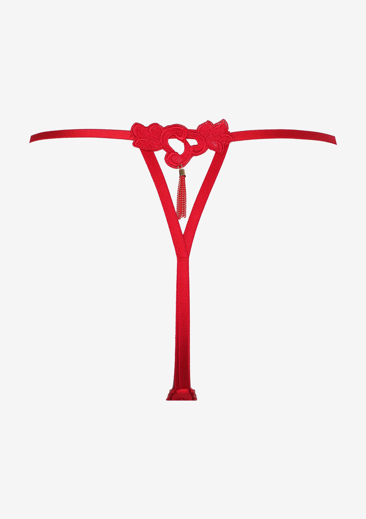 Sensuale perizoma rosso realizzato in morbido tessuto elasticizzato con deliziosi ricami floreali e un pendente catenine dietro. Stringato dietro. Modello La Rouge.