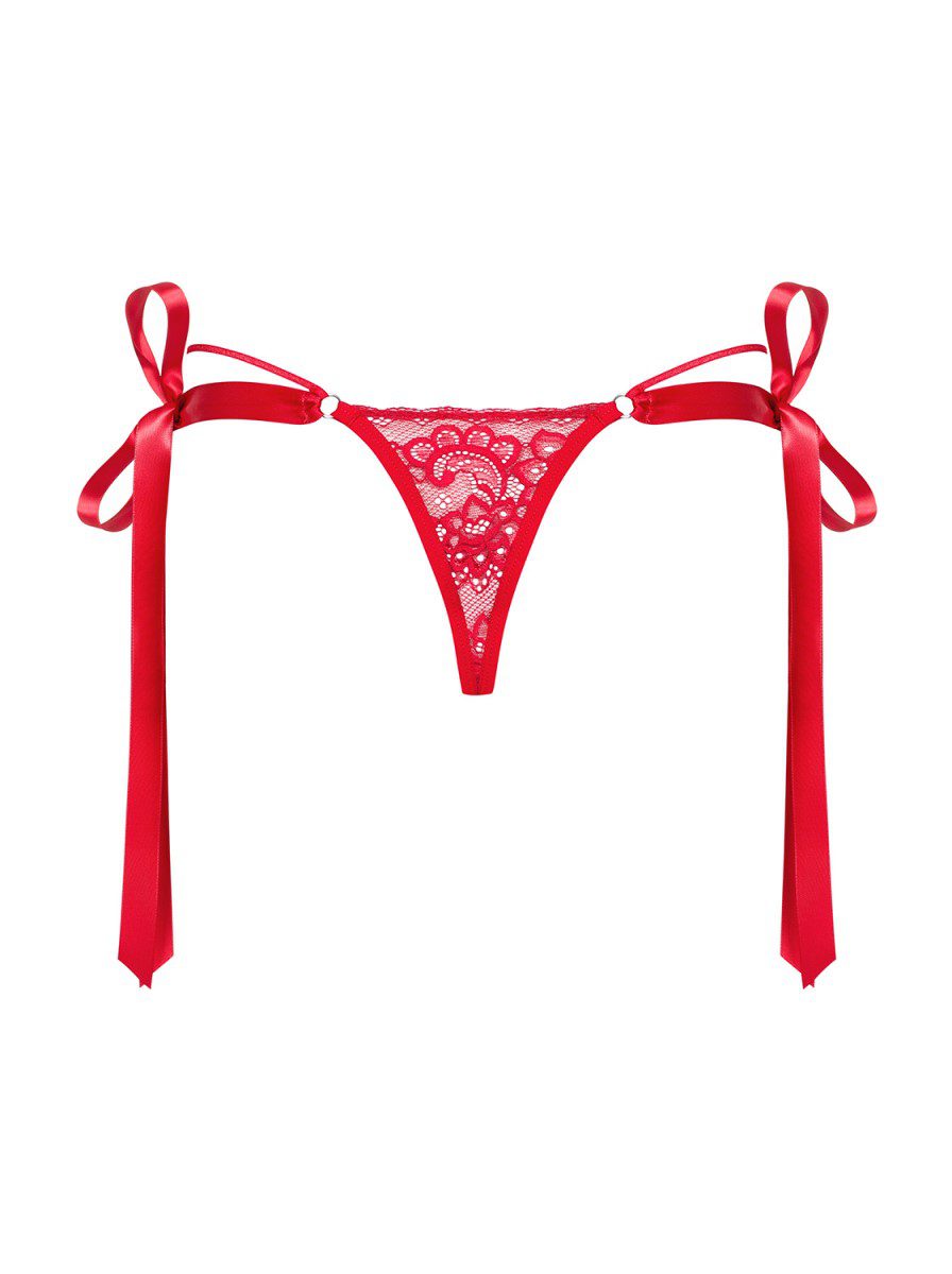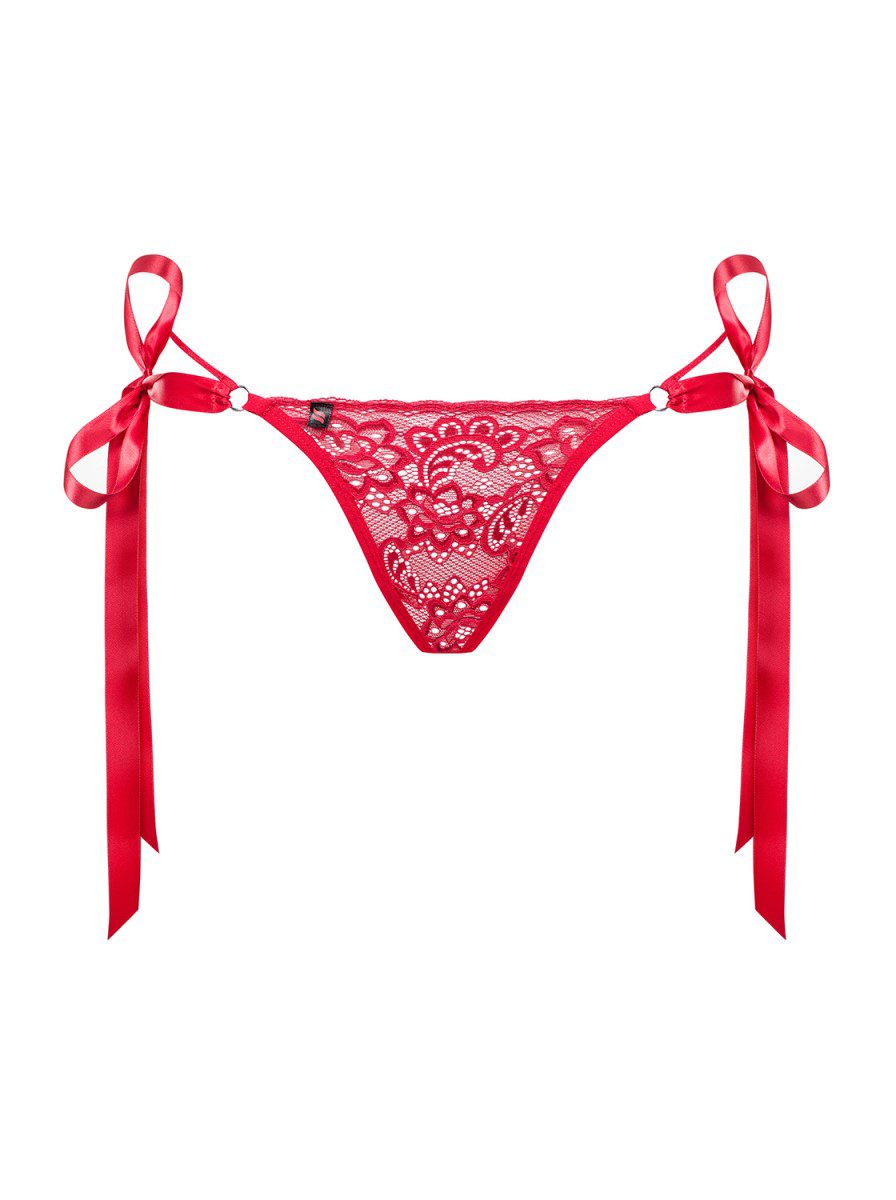 Grazioso e molto sexy perizoma in colore rosso intenso con nastri di raso da annodare e creare dei deliziosi fiocchi sui fianchi.