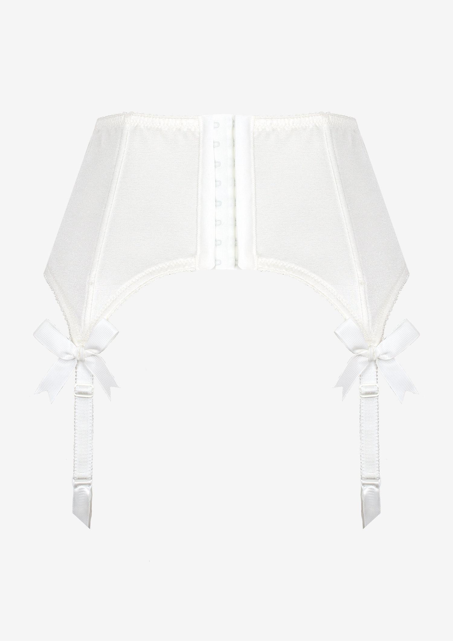 Sensuale reggicalze in morbido tessuto color panna con inserto in pizzo ricamato con fiocchi. Questo reggicalze stile retro caratteristico degli anni 50-60. Molto raffinato e femminile.