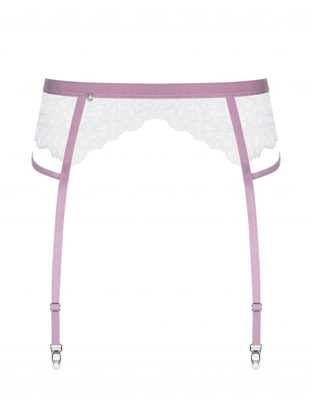 Reggicalze bianco realizzato in bellissimo pizzo bianco e stringhe vellutate color lilla.