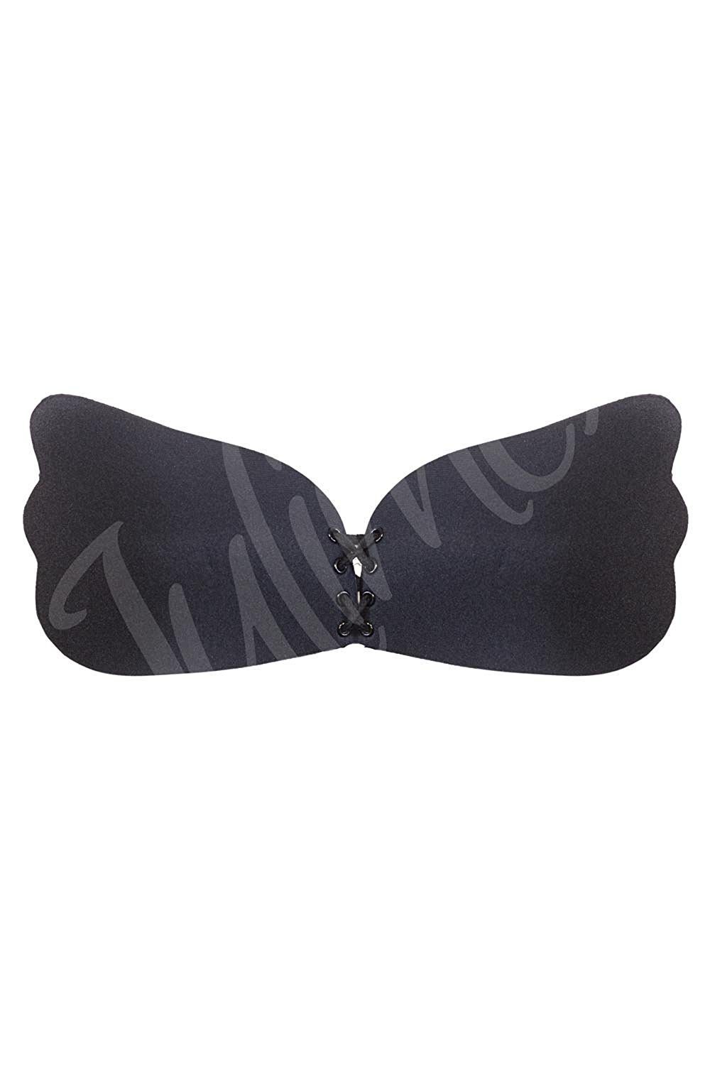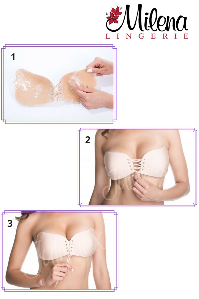 Reggiseno adesivo a forma di farfalla con effetto push-up. L’adesivo interno garantisce aderenza e facile applicazione al seno mentre la stringatura centrale enfatizza l’effetto push-up. Disponibile in 3 colori: beige, bianco e nero. Invisibile anche sotto i vestiti aderenti. Ideale sotto a maglie con scollature particolarmente profonde. Lavabile e riutilizzabile.