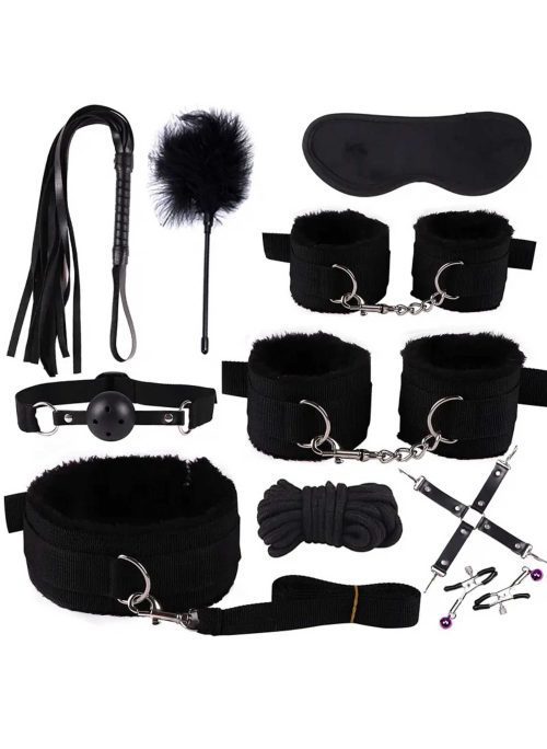 Scopri il piacere di esplorare nuove sensazioni con questo raffinato set BDSM 10 pezzi in nero, pensato per le coppie che amano unire seduzione, fiducia e gioco.