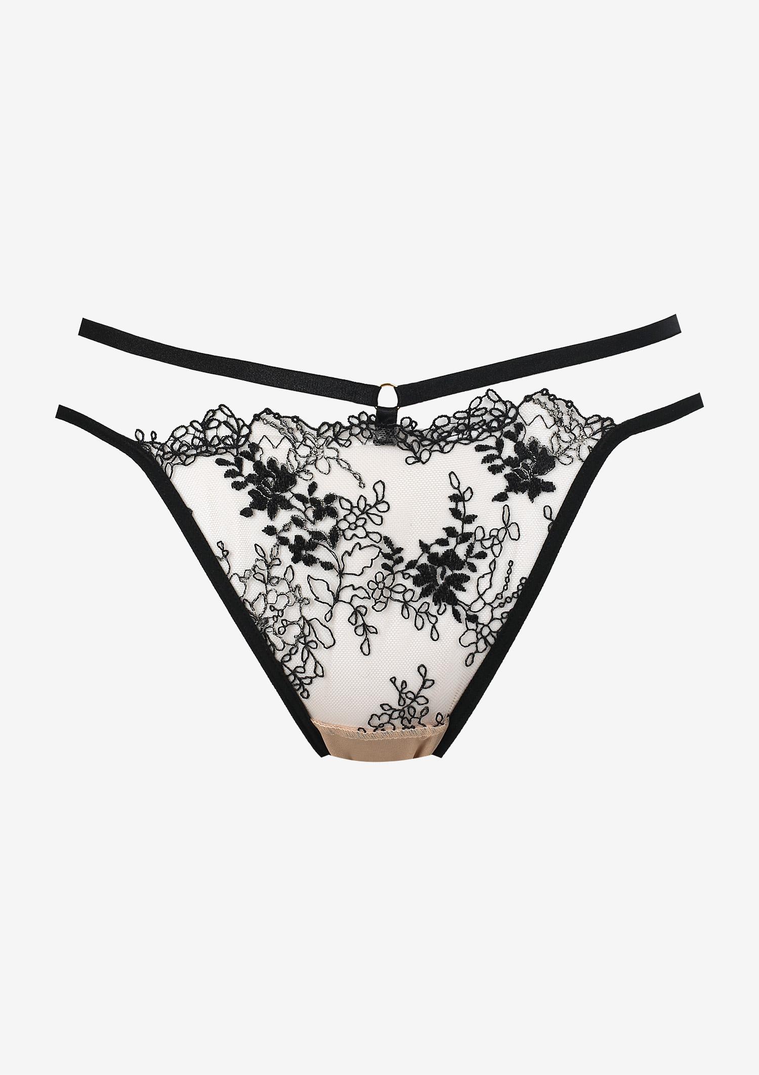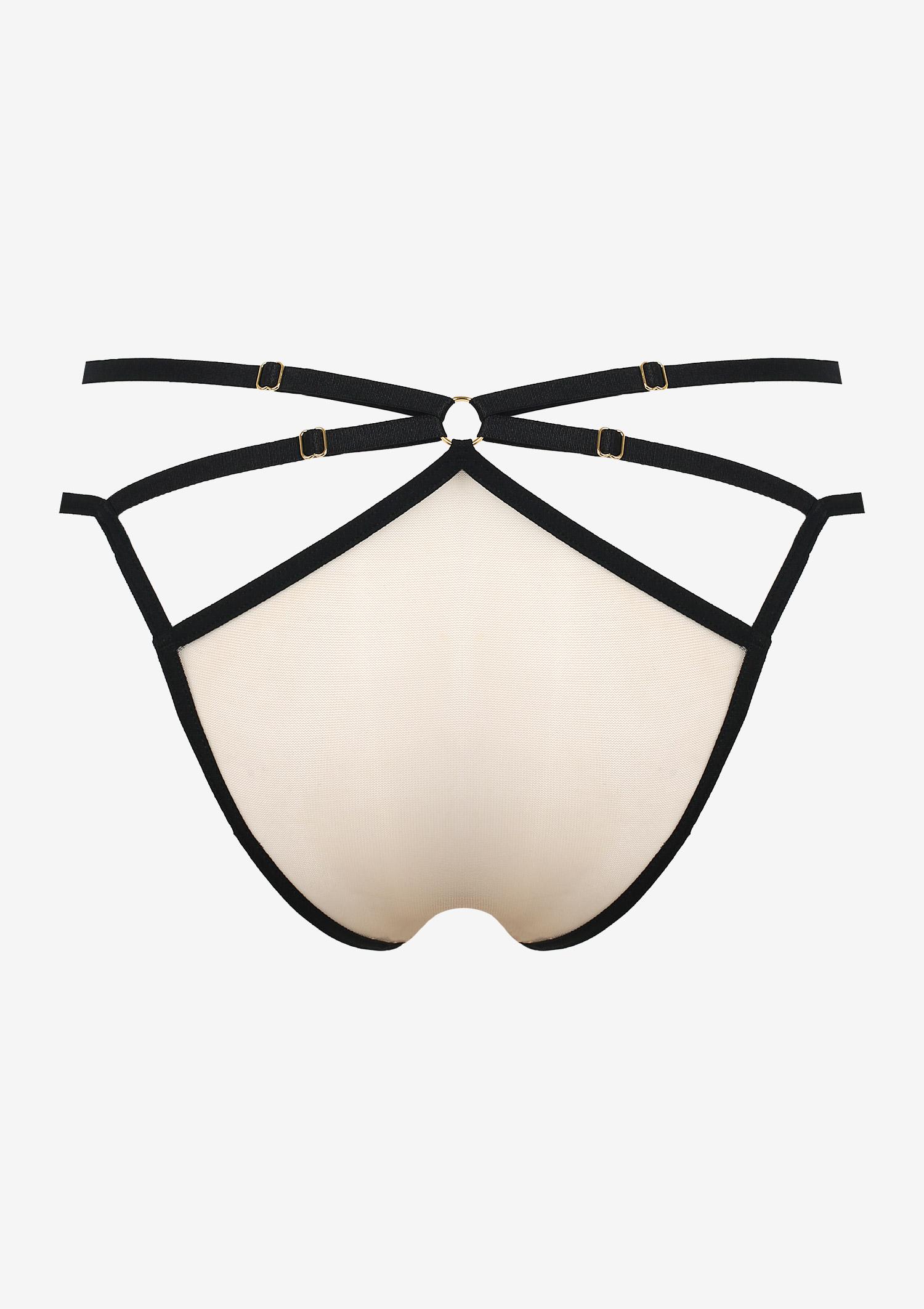 Elegante slip realizzato in morbido tulle colore beige con deliziosi ricami neri e dorati. Stringhe elasticizzate sui fianchi unite dagli anelli dorati. Stringhe regolabili in lunghezza per una perfetta vestbilità. Tassello in cotone.