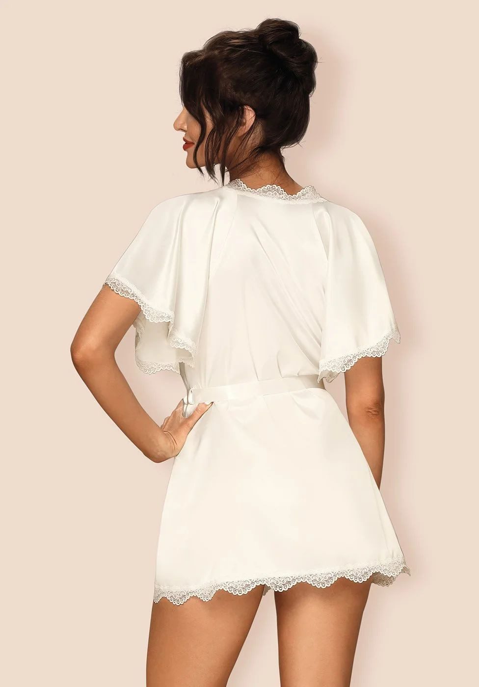 Vestaglia corta in bellissimo tessuto satinato color panna con bordi in pizzo. Con cinturino in raso.